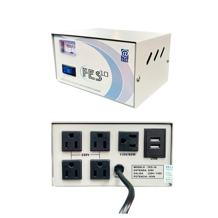 Estabilizador FES-10, 100% Estado Sólido, es ideal para protección de Computadoras y Equipos Electrónicos. Equipo Dual: 04 Tomas de 220VAC y 01 Toma de 110VAC (60 A) para conectar algún equipo que requiera este voltaje.