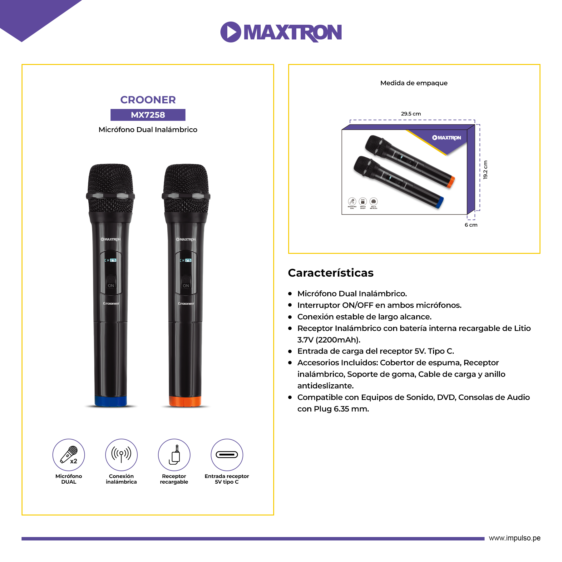 MICROFONO MAXTRON CRONER MX7258 DUAL INALAMBRICO