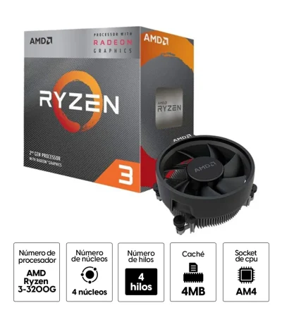PROCESADOR AMD RYZEN 3 3200G, 3.60 GHz, 4MB L3, 4 CORE, AM4, 14NM, 65 W.